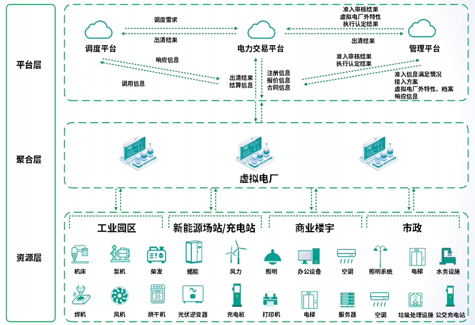 公司是泰州“首家”完成虚拟电厂注册的企业,虚拟电厂作为一种智慧能源管理系统,被称为能源产业链的“最后一公里“,其核心是将分布式的发电设备、储能系统、电动汽车、可调节负荷等资源聚合起来,顺利获得智能算法和通信技术统一调度,使其能够像传统发电厂一样参与电力市场交易或响应电网需求,从宏观层面上,实现能源的高效利用和电网稳定运行。
